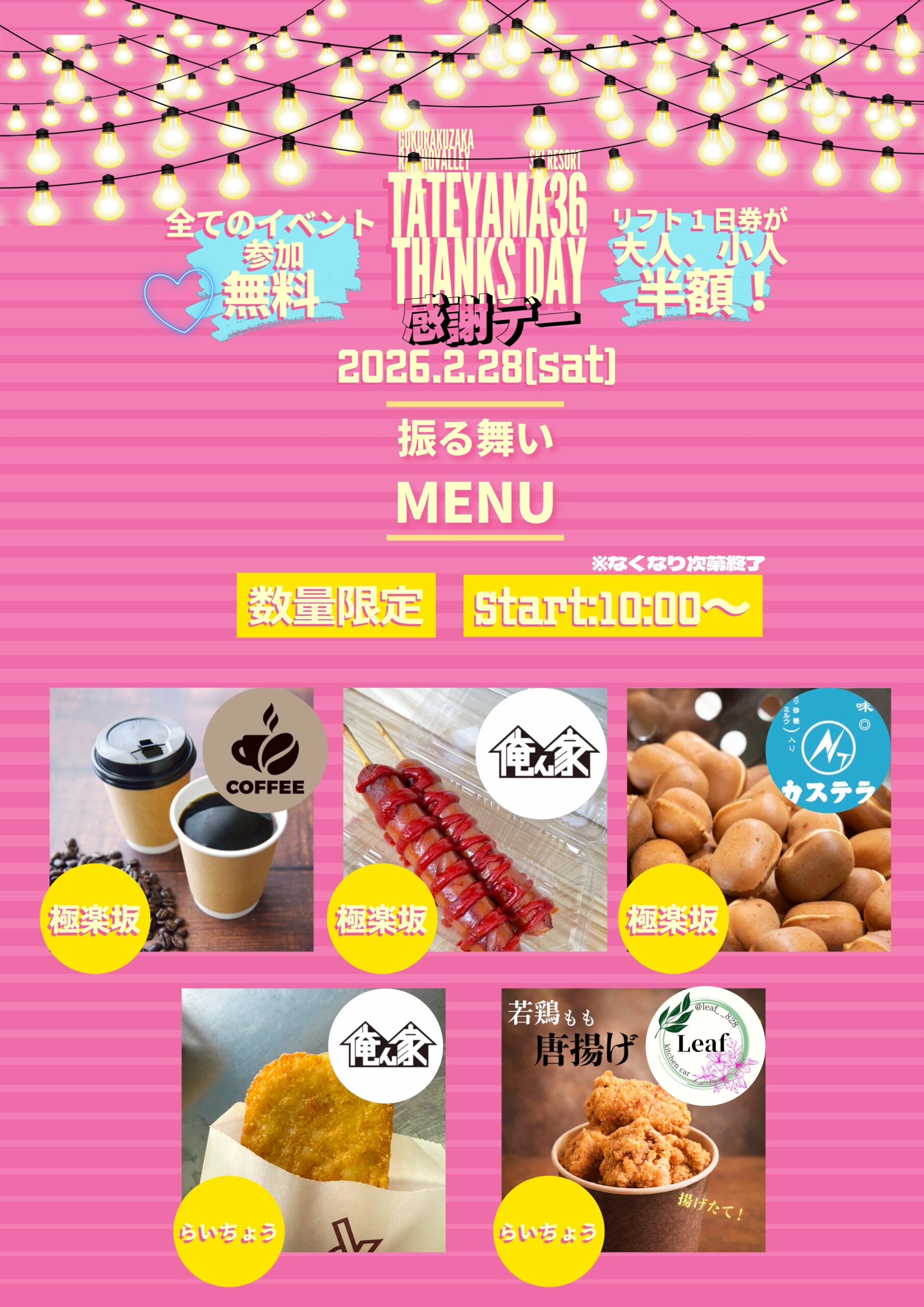 2026.02.23 イベント 感謝デー♪振る舞いのご紹介 感謝の気持ちを込めて、らいちょうバレー・極楽坂エリアにて、毎年大人気の振る舞いを行います。 10時よりお渡しいたしますので、お楽しみください♪ らいちょうバレー(スキーセンター前):鶏のから揚げ(キッチンカーLeaf) ハッシュドポテト(キッチンカー俺ん家) 極楽坂(スキーセンター前):フランクフルト(キッチンカー俺ん家) カステラ(nice time) ホットコーヒー 振る舞いのご紹介ダウンロード
